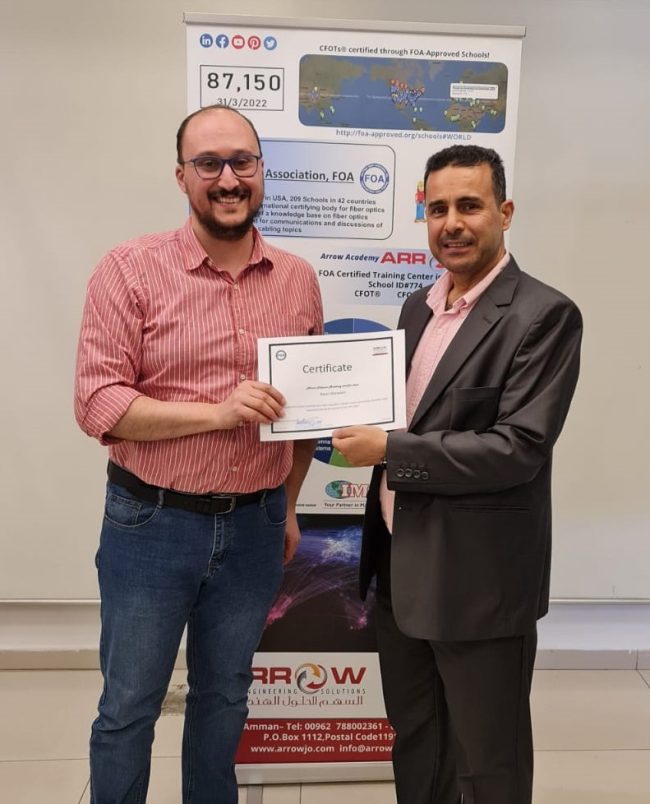 NEWS: 11-8-2022 Group of Public Security (PSD) Engineers have successfully graduated from the international certification program of fiber optics CFOT® “FOA-Fiber Optic Association” held in Amman by Arrow Academy.